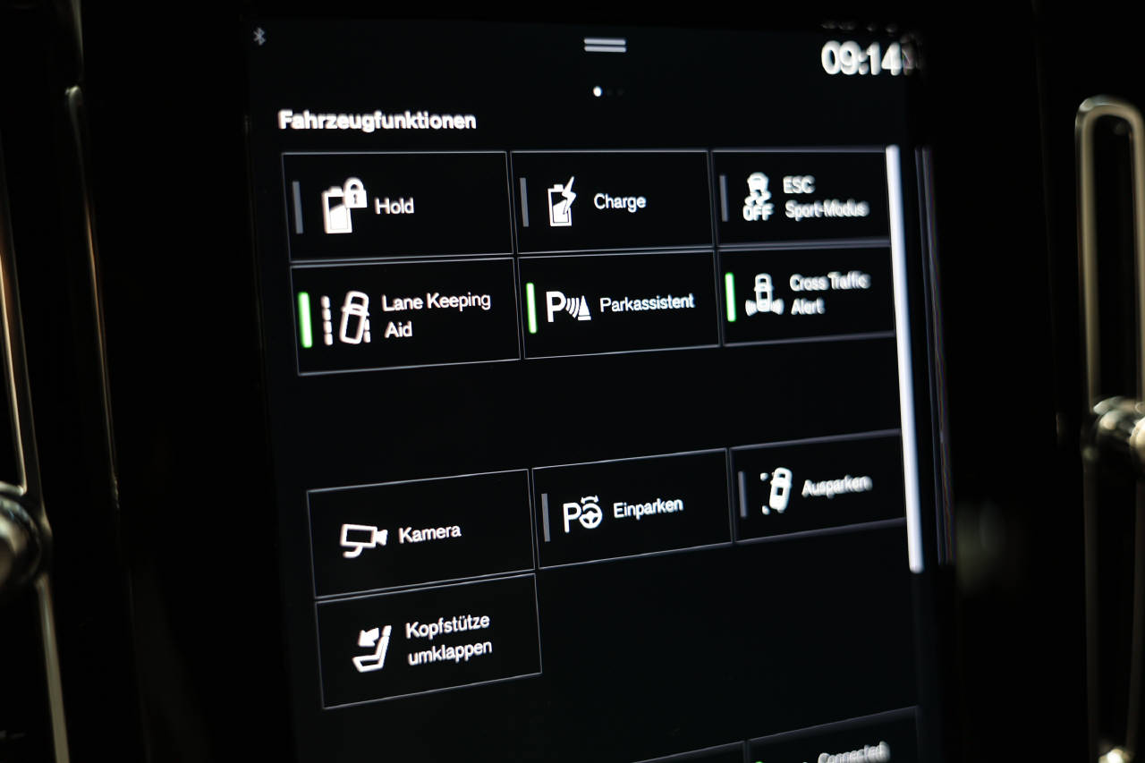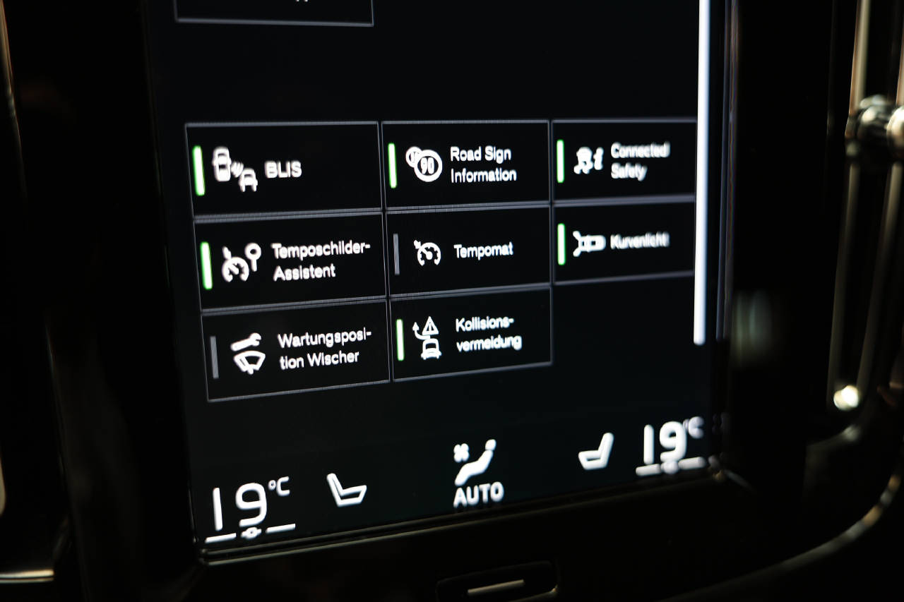Airbag Fahrer und Beifahrerseite, Elektrische Fensterheber vorne + hinten, Aussenspiegel elektrisch verstellbar und heizbar, Tempomat, EDS Elektronische Differentialsperre, Zentralverriegelung mit Fernbedienung, Durchladesystem, SIPS Kopf-/ Schulterairbag, Multifunktionslenkrad, Regensensor, Sportlenkrad, Gepäckraum-Trennnetz, Deaktivierung Beifahrerairbag, Aussenspiegel elektrisch anklappbar, Textilfussmatten, Scheinwerferwaschdüsen, Aktivkohlefilter, Zwei Zonen-Klimaautomatik, Rückfahrkamera, Aussenspiegel und Innenspiegel automatisch abblend, Türsicherung hinten/ elektrisch, Mittelarmlehne vorne mit Staufach, Keyless-Drive, WHIPS Schleudertrauma-Schutzsystem, Servolenkung geschwindigkeitsabhängig, Kopfstützen hinten elektrisch umklappbar, Elektr. Fahrersitz/ Memory für Fahrersitz und Auss, SIPS Seitenairbag Fahrer und Beifahrerseite, Knieairbag Fahrer, Mittelarmlehne hinten/ 2 Getränkehalter, Isofix-Kindersitzbefestigung hinten, Vordersitze höhenverstellbar, ABS und EBD Elektr. Bremskraftverteilung, Automatische Parkbremse, Panorama-Schiebedach, Pack Winter, Fernlichtassistent, Einparkhilfe vorne und hinten, Berganfahr- Bergabfahrassistent, Reifendruck-Sensoren TPMS, Stop + Start System, Spurhalteassistent LKA, LED Tagfahrlicht, Rücksitze umklappbar 60/40, USB-Anschluss, Bluetooth Freisprecheinrichtung, Details siehe gültige Preisliste des Importeurs, Leichtmetallräder 19" 5-Doppelspeichen, Keine Gewähr auf die Angaben der Serienausstattung, DAS Driver Alert/ Assistenzsystem, DAB+ Digital Audio Broadcast, LED-Nebelscheinwerfer, Digitale Instrumentierung, Pack Innenraumbeleuchtung, Lendenwirbelstützen elektr. für Vordersitze, Heckklappe elektrisch mit Freihandfunktion, VSP Volvo Swiss Premium, Verkehrsschild-Erkennungssystem, City Safety inkl. Kreuzungsbremsassistent, Drive-Mode, Wireless Charging für mobile Geräte, LED-Scheinwerfer mit Fernlichtassistent, Beinauflagen einstellbar, Apple Car Play/ Android Auto, Dachhimmel Charcoal, ESC Fahrdynamikregelung, Pack Park Assist, InfoTS Sensus Connect mit Premium Sound Harman/ Ka, Garantie Batterie 8 Jahre/ 160'000 km, Erweitertes Luftqualitätssystem, Pack Power Seats, Pack Light, Komfortsitze mit Microfibre, Pack Business